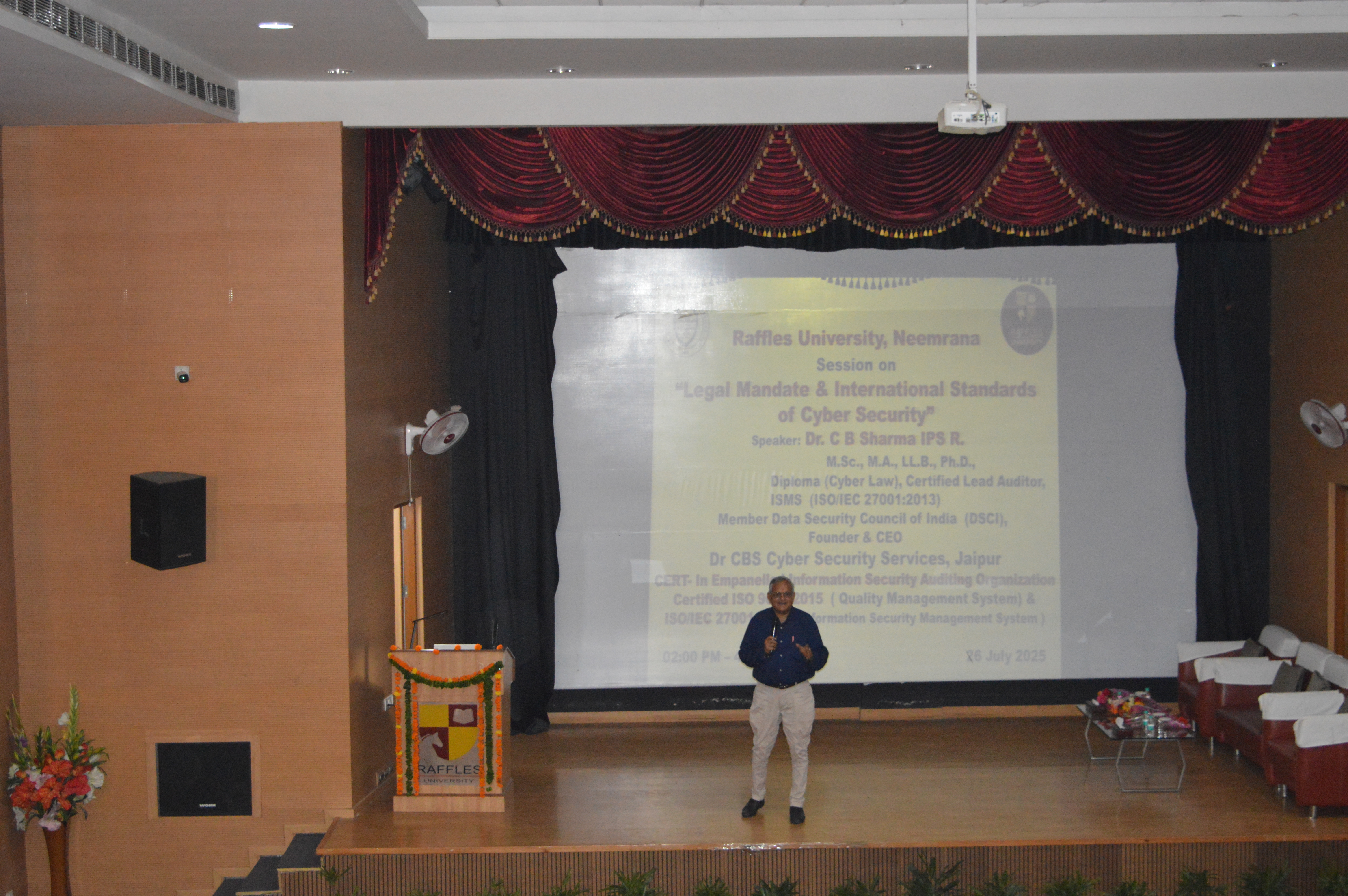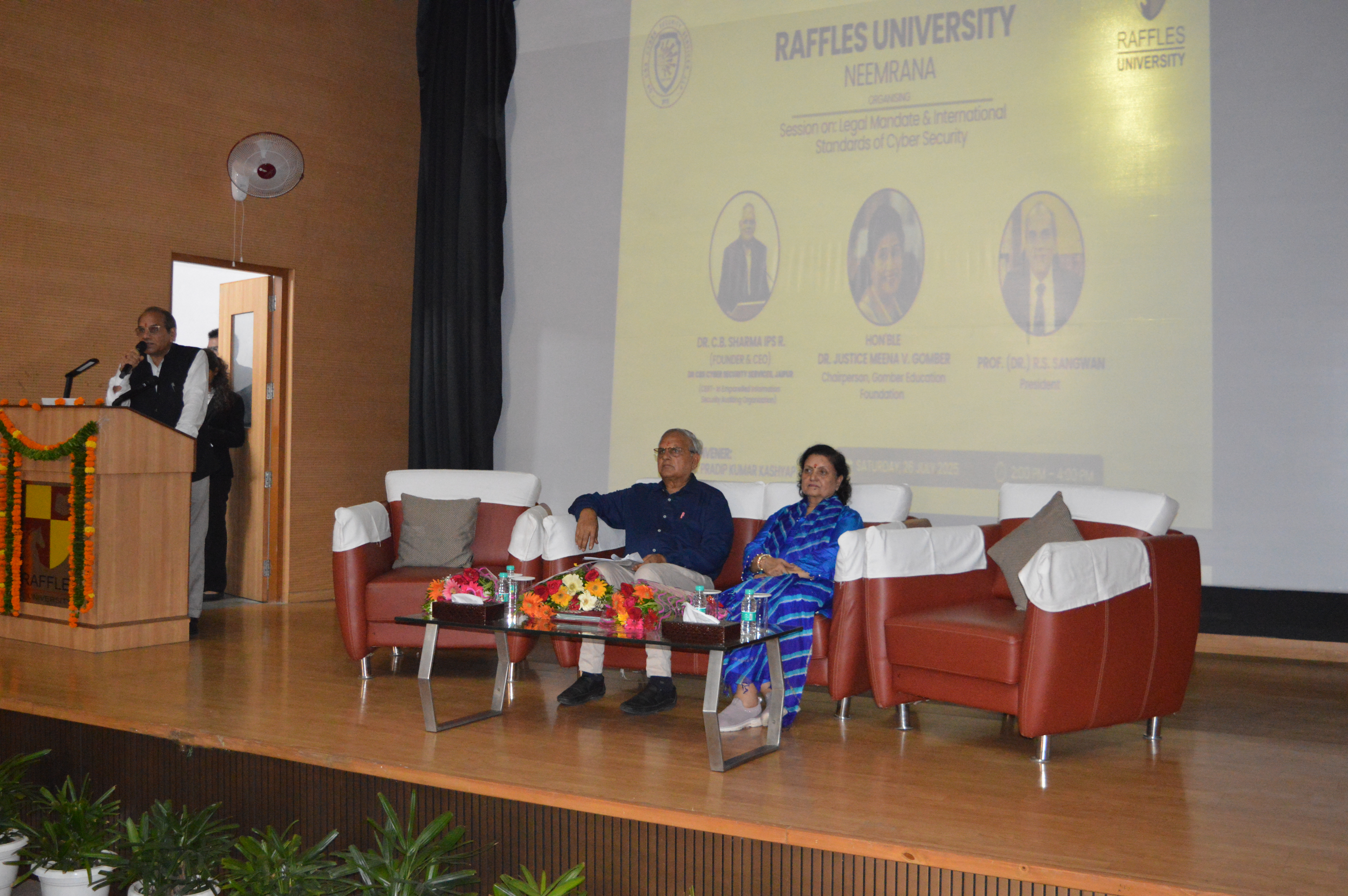 Date: 26th July, 2025*Session on “Cyber Security Legal Mandates and International Standards”* 26th July 2025 School of Law, Raffles University, Neemrana, organized a highly engaging and informative session on *“Legal Mandate & International Standards of Cyber Security”* on 26th July 2025. The event attracted students, faculty members, and professionals from the academic and legal community, all keen to understand the evolving landscape of cyber security. The session was graced by Dr. C. B. Sharma , IPS (Retd.), Founder and CEO of DR CBS Cyber Security Services, Jaipur. A distinguished expert in the field, Dr. Sharma is associated with a CERT-In empanelled Information Security Auditing Organization. Drawing upon his extensive experience in cyber security, Dr. Sharma delivered an eye-opening talk covering the Legal Mandates governing cyber practices in India, key international standards, and practical issues surrounding cyber crime, digital arrest, and the provisions under the Information Technology Act, 2000. His detailed analysis and case references provided attendees with a comprehensive understanding of the real-world implications of cyber threats and the legal safeguards in place. Accompanying him was Mrs. Manju Sharma , Designated Partner in DR CBS Cyber Security Services, Jaipur. Her presence underscored the collaborative leadership behind the organization’s growing influence in the field of cyber security consultancy and auditing. The session also featured an address by Hon’ble Dr. Justice Meena V. Gomber , Chairperson of the Gomber Education Foundation, who emphasized the growing importance of cyber awareness and the urgent need for stringent cyber security measures in academic and public spaces. Her thought-provoking insights encouraged the audience to reflect on the ethical and legal challenges of today’s digital era. The program commenced with a warm welcome from Prof. (Dr.) R. S. Sangwan, President of Raffles University, Neemrana , who highlighted the university’s commitment to providing contemporary and socially relevant education to its students. He acknowledged the significance of such sessions in equipping the next generation with the knowledge to navigate a technology-driven world safely and responsibly. The event concluded with a formal vote of thanks delivered by Dr. Pradip Kumar Kashyap, who expressed gratitude to the speakers, dignitaries, and participants for making the session a success. He particularly appreciated the efforts of the organizing team in fostering a platform for meaningful dialogue on cyber laws and digital safety. The session was not only an academic milestone but also a step forward in raising cyber security awareness and legal literacy among the university community.