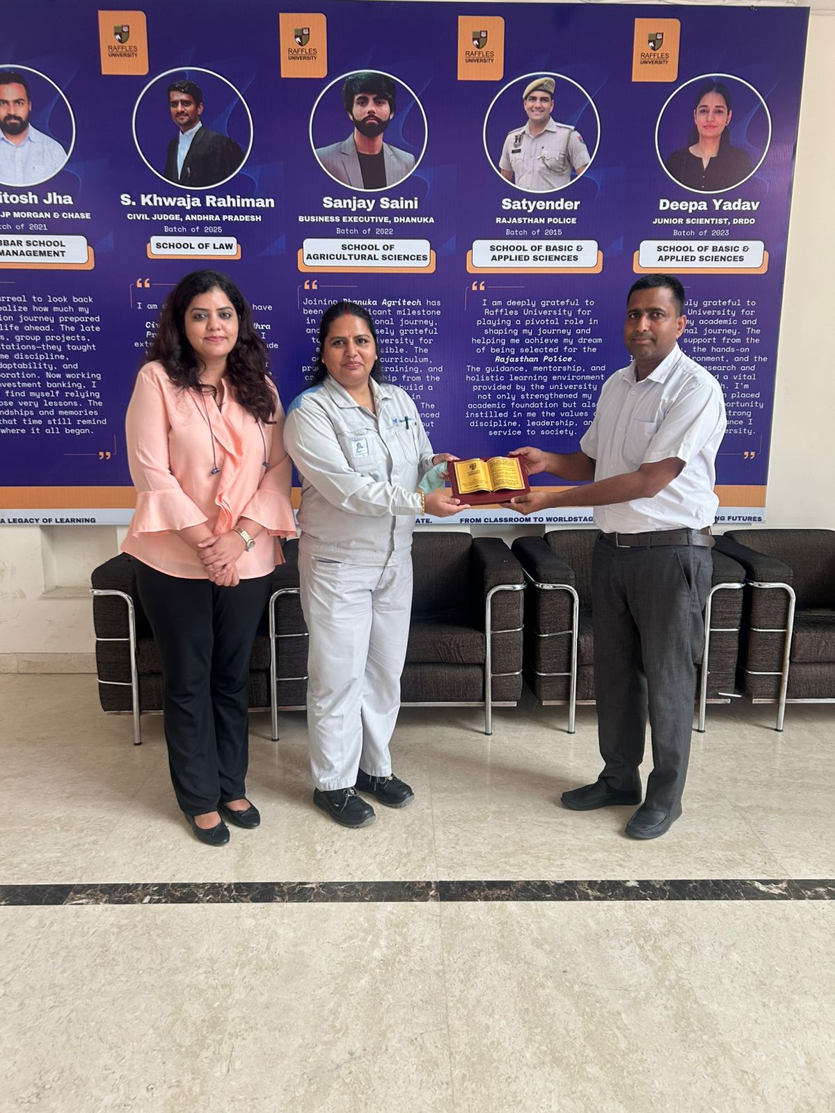 Raffles University witnessed a successful placement drive as INSAA Agriculture Consultant visited the campus to recruit students for various leading agri-based companies. After a rigorous selection process, eight students from the School of Agricultural Sciences (SOAS) were selected for promising roles across the agricultural sector. The Vice Chancellor of Raffles University, Prof. (Dr.) Rajender Singh Sangwan congratulated the selected students and appreciated their hard work, dedication, and performance during the recruitment process. He also expressed his gratitude to INSAA for offering valuable industry opportunities to the university's budding professionals. The drive was efficiently coordinated by Dr. Pardeep Kumar, Assistant Professor at SOAS, whose efforts were instrumental in ensuring the smooth conduct of the event. The Training and Placement Cell extended heartfelt thanks to Dr. Kumar for his support and congratulated all selected students, wishing them success in their professional journeys.